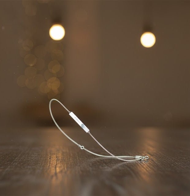 A sleek and meaningful personalized bracelet featuring a minimalist bar plate engraved with your chosen name, date, initials, or message. Available in Gold and Silver, this elegant bracelet is designed with a delicate chain and a polished bar—perfect for gifting, daily wear, or keeping a special memory close.